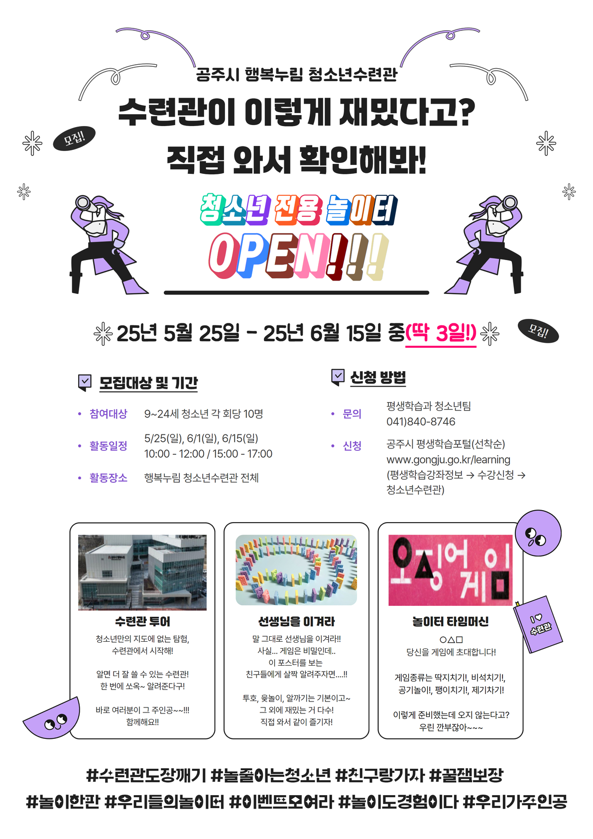 | 강좌명 | 수련관 투어, 선생님을 이겨라!, 놀이터 타임머신(오후반) | 교육기간 | 2025-06-01~ 2025-06-01 |